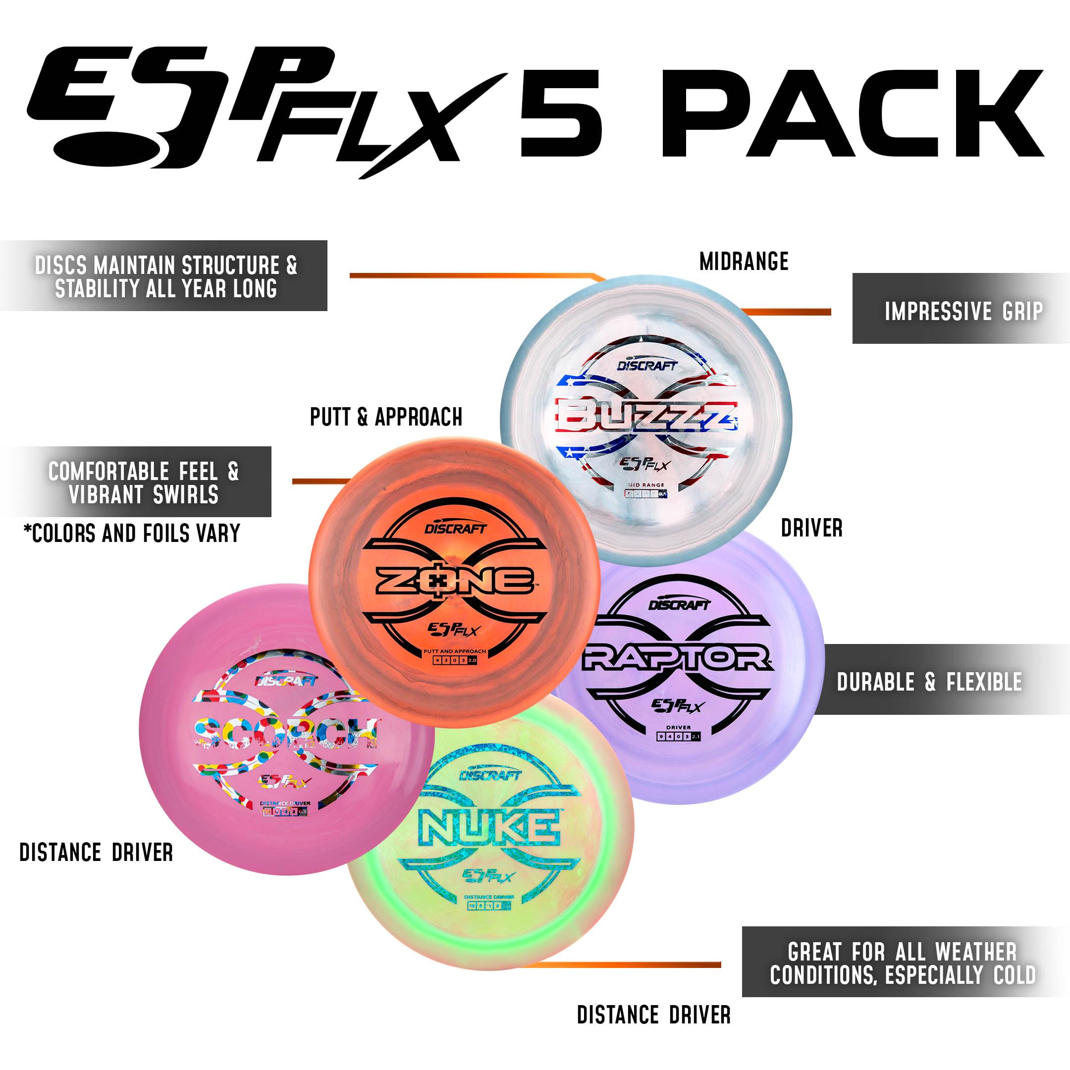 - Ideal for All Skill Levels: Whether you're a beginner looking to build your collection or an experienced player seeking season-specific discs, this pack is versatile enough to cater to all. With a diverse selection, whether you're looking for a putter, mid-range, or driver, this pack has it all. It includes: ESP FLX Zone, ESP FLX Buzzz, ESP FLX Scorch, ESP FLX Nuke, ESP FLX Raptor