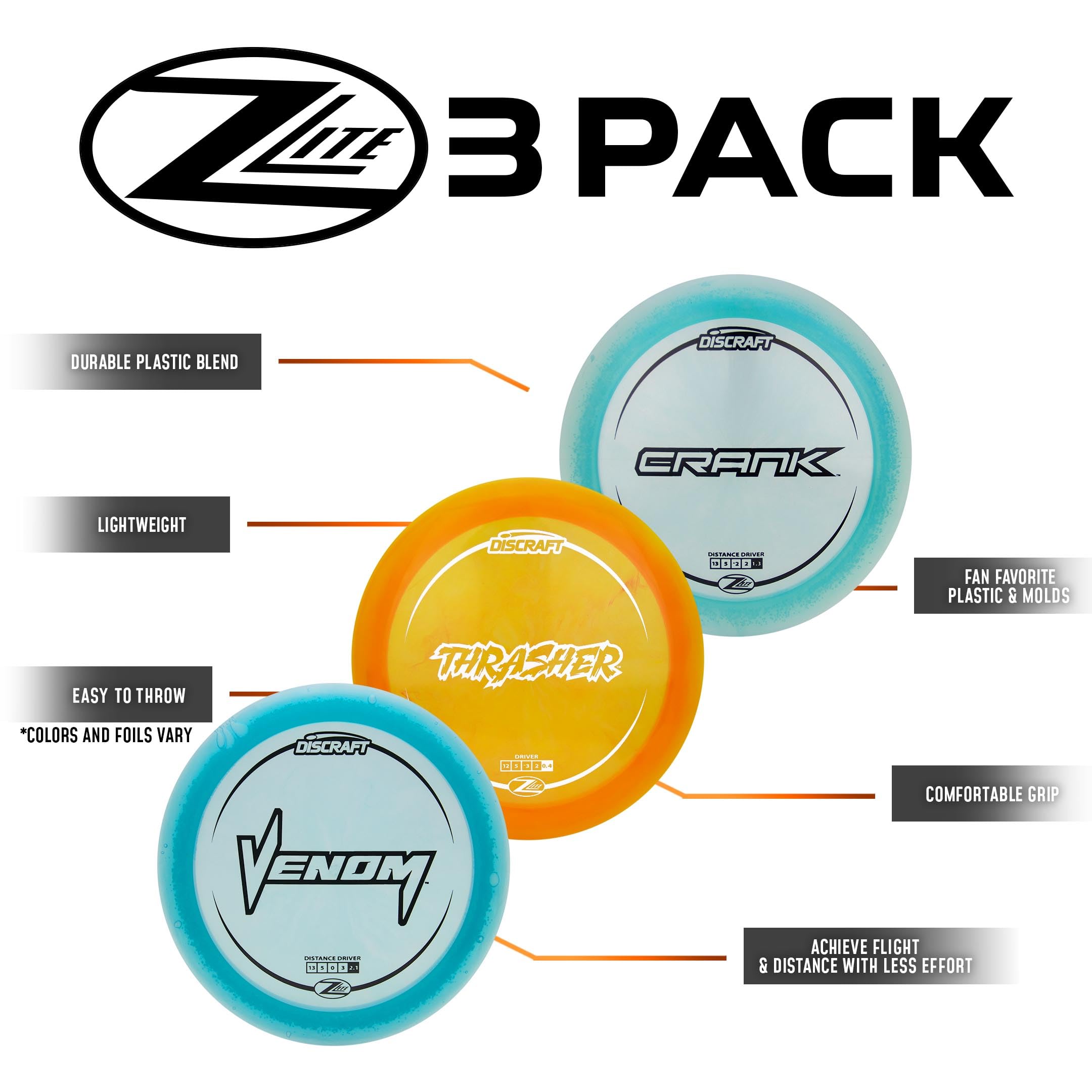 Discraft Z Lite Three Pack – Lightweight Disc Golf Set | Including – Z Venom, Z Crank, & Z Thrasher | Disc Weight (141g-166g), Color, & Foil Will Vary—